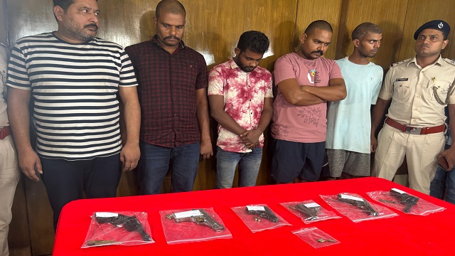 Bhubaneswar: Acting on reliable intelligence input, the Airport Police Station conducted a raid in the Pokhariput area and apprehended five accused persons and seized illegal firearms and other incriminating materials. During the operation, police intercepted a suspicious vehicle and detained five individuals, including four interstate arms traffickers from Uttar Pradesh and Madhya Pradesh, who were found in possession of illegal firearms. One local associate from Salepur, Cuttack was also apprehended, who was there to procure the firearms. The arrested persons have been identified as Prabin Kumar Singh (40), Raghvendra Singh (28), Abhishek Rajput (31), Indrajit Singh (38), and Sk. Sakil (28). Police also seized four 7.65mm semi automatic pistols, one six round revolver, one single shot, 18 rounds of live ammunition, a car bearing Reg. GJ-27-DM-5196 and five mobile phones from their possessions. According to police, Prabin Kumar Singh, a native of Ballia (U.P.), had been staying on rent at Jatani Gate area of Bhubaneswar for the past two months. He is a professional arms peddler, sourcing illegal firearms from other states. The three other interstate accused (Raghvendra Singh, Abhishek Rajput and Indrajit Singh) are his close associates involved in the arms trade network. Sk. Sakil, a resident of Salepur, was present to procure firearms from the gang when the police operation was launched. The criminal antecedents of the accused persons are being verified. Their network and possible supply routes into Odisha are under scrutiny.